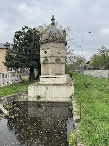 This monument marks the end of the artificial watercourse. From this point, the water runs in culverts to re appear in runnels in Trumpington Street and St Andrews Street. Other culverts feed ponds in certain of the colleges.