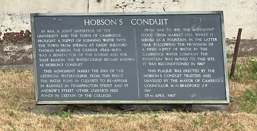 Read moreIn 1614, a joint enterprise of the University and the town of Cambridge brought a supply of running water into the town from springs at Great Shelford. Thomas Hobson, the carrier (1544-1630) was a benefactor of the scheme and for that reason, the watercourse became known as Hobsons Conduit.