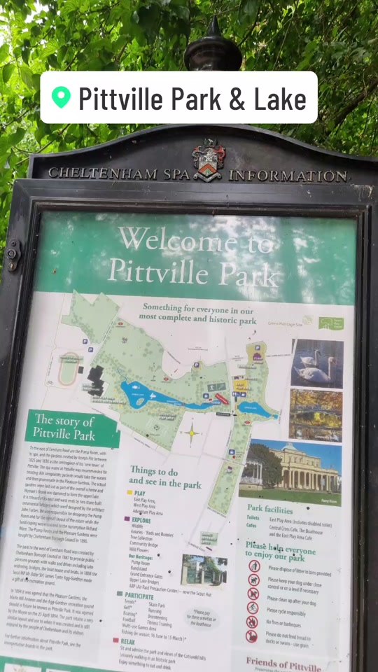 It has everything a child would want - play areas for different age groups, paddle boats, an adventure trail, swans and ducks to feed, ice creams & refreshments, a few small animals, a large green to play in, room to walk around the lake, rowing boats, a sand and water play area, a skate park, tennis courts, and now a zip line. There are always other birds (on the lake, and in the reeds and trees), that bird watchers can enjoy. My grandson and I take our binoculars with us. We have spotted herons, great crested grebes, moorhens, cormorants, and canada geese so far. The two halves of the park are connected by an underground tunnel, which young ones love to hear their voices echo in. Pitville Pump Rooms (famous for Cheltenham's Spa waters), can be found at the top of the park; with a bandstand on the huge green in front. The green is perfect for picnics; including dogs - which are always welcome in the park. Fishing is permitted on the lake during the fishing season, for permit holders. There are public toilets by the toddlers play area (which is fenced and gated), near the tunnels connecting the two halves of the park. The park is well signposted, with many information boards; and the park and grounds are...