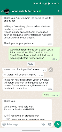 Read moreQuite honestly this has been the worst delivery, installation and customer service experience I have ever had. We ordered a new washing machine from John Lewis, which included installation. The "engineer" wasn't allowed to turn the water off as wasn't qualified to turn the water off. He messed around and then left without fitting the machine. However, he neglected to tell us he hadn't put the waste pipe back on the washing machine, so when the kitchen tap was run, it flooded the kitchen and shorted the electrics. JL called me to rearrange the removal of the old machine, but when they heard what happened they passed it onto their "Managers" department. I then got a call, where I was accused of trying to claim compensation from them and that they wouldn't be paying anything, and their engineer didn't have to warn us the waste to the sink hand't been returned to how they found it. It was the most disgusting customer service I have ever encountered and basically accused me of looking for money. When honestly, they had arranged the call, not me. She didn't even apologise for all the issues. After this they arranged another visit to bring the new washing machine (oddly they told me I had refused the new one when I hadn't). When he came to deliver it, he took the old and they once again updated the system to say I'd refused the new one. When I called to find out what was happening, I then found out the new machine was smashed and dented and thatâs probably why they didn't want to bring it up. We've now been waiting ages for a new machine (we don't have one as they took the old one away first) and JL really don't seem to care. It's just "we'll pass that on to our warehouse", "I'll put that in a comment on your notes". I usually order from JL as I respected their customer services and delivery. They are usually a little more expensive, but previously it was worth it. Now, I can't imagine buying anything from them again and would recommend people think twice before using them. Such a shame this as happened to such a...