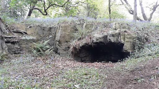 Two hundred year old woods with nice trees and also cliffs from old sandstone quarries. A pocket of wilderness in the city. I'm here now and I can hear three or four species of birds alongside the noise of two guys bonking a tennis ball at a nearby court. But I shall wander further...