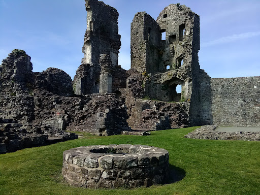 A small parking area is available beside the main gatehouse on the west side of the ruins, although it is not clearly marked. However, visitors can inspect the southern castle walls from the main road. To access the eastern walls, visitors can take a short path down Heol yr Eglys, a side road. This path leads to a field where the exterior of the northern walls can be viewed.
