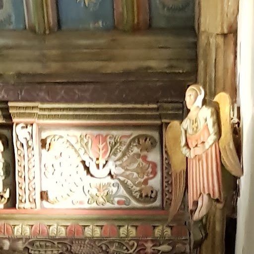 Rug Chapel, dedicated to the Holy Trinity, is a highly decorated, 17th century private chapel that escaped both the white-washing iconoclasm of the Protestant reformation and the over-zealous restoration of the Victorian era. The chapel was built in 1637 by Colonel William Salesbury, a Royalist and privateer, with the help of Bishop William Morgan, known for his translation of the Bible into Welsh. Whilst the exterior of the single-cell structure is plain and unassuming, the interior of the chapel is rich and elaborate with decoration and ornamentation on nearly every available surface. A large gallery is built into the west end. All but the screen and stained glass are originals from the 17th century. The chancel screen is an interesting later addition, put up in 1854 but built in the Jacobean style to look like it’s been there all along. There are three types of pew in Rug Chapel. There are large, ornate canopied pews in the sanctuary itself and box pews can be found in front of the screen. The most interesting are the bench like pews that fill the rest of the nave. On each side of the nave the ends of these pews are all a single piece of oak, scalloped between the benches and carved with mythical creatures. The north wall of the chapel nave is adorned with a large memento mori wall painting, complete with anatomically questionable skeleton. The painting, designed to remind the congregation of life’s impermanence, was a very popular motif in the...