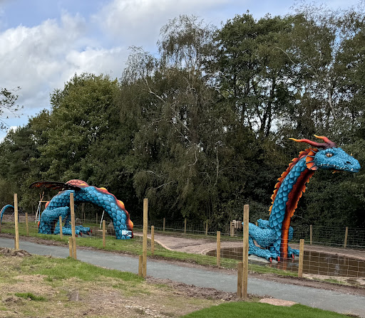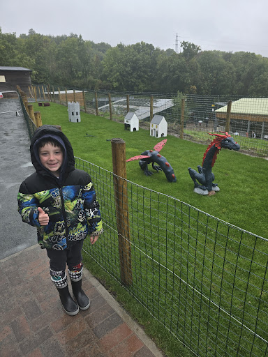 Once we were actually into the farm there's still many parts alongside the paths that are just churned up mud. The paths going down the hill are mostly nice new tarmac. As soon as you start to walk towards Rex the dragon it turns to rough path and then to a literal stone chipping path all around the "Eye paddock" just past him. This would've made traversal around the whole paddock completely inaccessible with a pram even with our prams big wheels. Luckily there wasnt a single animal in the entire paddock so that saved us attempting to make the effort to go and "off-road" the pram around it. As for Rex, his new paint job is lovely but he's still caged in and the little puddle/pond isn't full. When we there today he was still getting another coat/clear coat which was lovely to taste in the air as we walked by his cage.