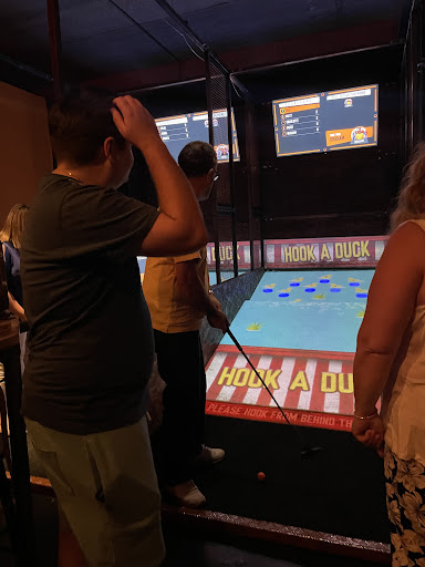 Like mini golf but all in one lane, not a course that you move around. The projector changes the game but it’s the same holes each time. Interesting concept but think it could be improved a little. Not sure how possible this is but maybe within the lane the holes could move around or change in some way because it did get a little boring after half an hour.