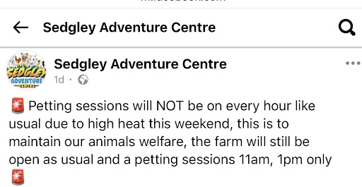 Edited after owner response - Itâs confusing: either itâs too hot for petting due to animal welfare, or it isnât. You canât say itâs unsafe while allowing a group session to go ahead. We tried to book a petting session when we arrived but were told none were available. However, once inside, we saw a session happening with about 20 children. Since my child just wanted a chance to pet an animal, we tried to join but were told we couldnât without a ticket. I went back to get a ticket, only to be told again that there were no petting sessions available today. The owners would better understand our confusion if they had contacted us directly, rather than relying on school-aged volunteers working there and addressing the issue publicly online. We checked your Facebook page and found no advance notice of the change in petting availability to no public sessions.
