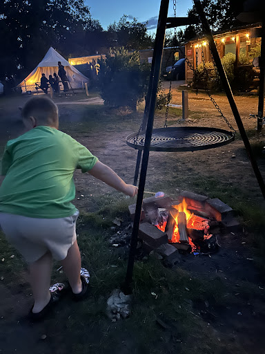 Booked this of the morning we stayed, as my youngest son was on an inset day the day after. Booked via booking.com £57 for one night. Email with instructions duly followed lots of them including directions which looked daunting. As it happened it was not, follow the post code given and it will take you to the park entrance you are then following the residents only road. The instructions are easy to follow after that. Lovely warm welcome from the lady on site, directed us to our tent No.4 and much was enormous for the two of us. Very clean inside, mattress were two single and one double, carpets on the floor and a chest for your stuff plus one log effect heater which on full power was very effective. It was cold during the night without it on. One small lamp . Outside you have a picnic table and a tripod BBQ which underneath would double up as a fire pit. We took a disposable BBQ and sat this on top of the suspended grill worked brilliantly. Separate communal kitchen area was very clean and you have a fridge allocated to your tent, shared with two others I think, be warned ours was so cold it froze the bacon. Milk cofffe tea pan’s cutlery condiments abound. Stove was massive and very clean. Toasters and microwave available. All very tidy and somewhere to eat under cover also. Toilets showers Mens were spotless and shower piping hot, would agree more hooks needed. Very quiet site as only 3 family’s were there. One family toasting marshmallows on their fire pit looked delicious: close to the park and water Hirt walk away. Didn’t do anything really just read and chilled and one small walk. Overall very nice indeed. Tip...