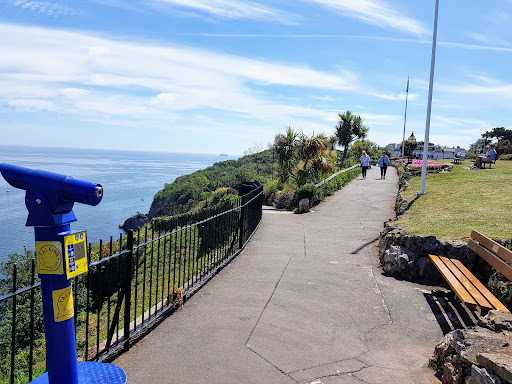 A beach a fair hundred feet or so below the promenade that is accessible by either a steep steep road with limited space at the bottom with pay and display, you can also walk down steps embankments and steps which is a rough walk down. It is a very difficult walk at times.The best option for those with walking difficulties is the cliff railway. At a cost of £2.10 per adult in July 2020 one way the return visit is £2.90. There is Babbacombe Beach and Oddicombe beach linked by a walkway and steps. Both are predominantly stone beaches with a very pleasant gentle open into the sea. In summer especially at weekends many boats are moored up with people and dogs aplenty. There are toilets at both (free, but you may have to queue) there is a cafe and shops (Oddicombe Beach) beach access is by steps and slope once down the road path or cliff railway. The walk up is very tough indeed. Great place to relax take a drink down with you. Above around the promenade there is a theatre great fish and chip shops ( Hanburys is nearest then Drakes and The Usual Place is a bit further out)) a few pubs (Babbacombe Inn and The Buccaneer as well as the Royal Court Hotel) as well as cafes too there is a wonderful place that does cream...