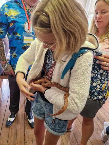 Today, I learnt all about Death's Head moths and watched video of them vigorously wiggling and wing beating away as they probed long tongues into honeycomb, gorging themselves silly. I learnt about Egyptian mummies. I cuddled a Bearded Dragon, rough where you'd think she'd be smooth, and soft where she looks most spiky. I handled a vibrant orange corn snake and two cool, rubbery Royal Pythons, the larger of the two laced around my shoulders just calmly chilling out with me.