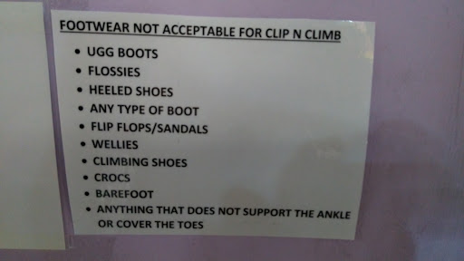 Visiting Clip'n'Climb again. However, disappointment at the door. The footwear rules seem to have changed. Their website says that you must wear footwear that covers your toes and specifically forbids sandles etc. So the booking was made, times picked and the session paid for online. On arrival however there is a sign sellotaped to the counter which forbids boots, heeled shoes and more. My kids were wearing Doc Martin boots, which are not allowed. In order to gain entry we had to sign a hastily written disclaimer to get in.