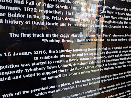 The David Bowie Statue is a bronze sculpture of David Bowie sculpted by Andrew Sinclair and unveiled in 2018 in Market Square, Aylesbury, Buckinghamshire by Howard Jones.