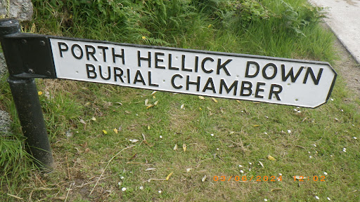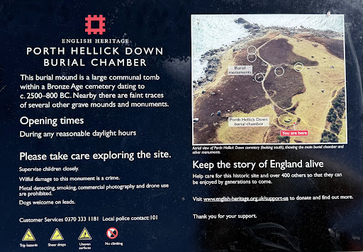 This unusually large chambered tomb, an example of a Scillonian 'entrance grave', is part of a larger cemetery. Entrance graves are a Scillionian variant of chambered tombs found more widely in Britain and western Europe. This one is past of a cemetery of at least eight other cairns and entrance graves on Porth Hellick Down, the plateau to your right. They were built over 4,000 years ago in the late Neolithic or early Bronze Age. The unroofed passage of this entrance grave is partially blocked at both ends by upright stones, perhaps placed to restrict access or views into the chamber