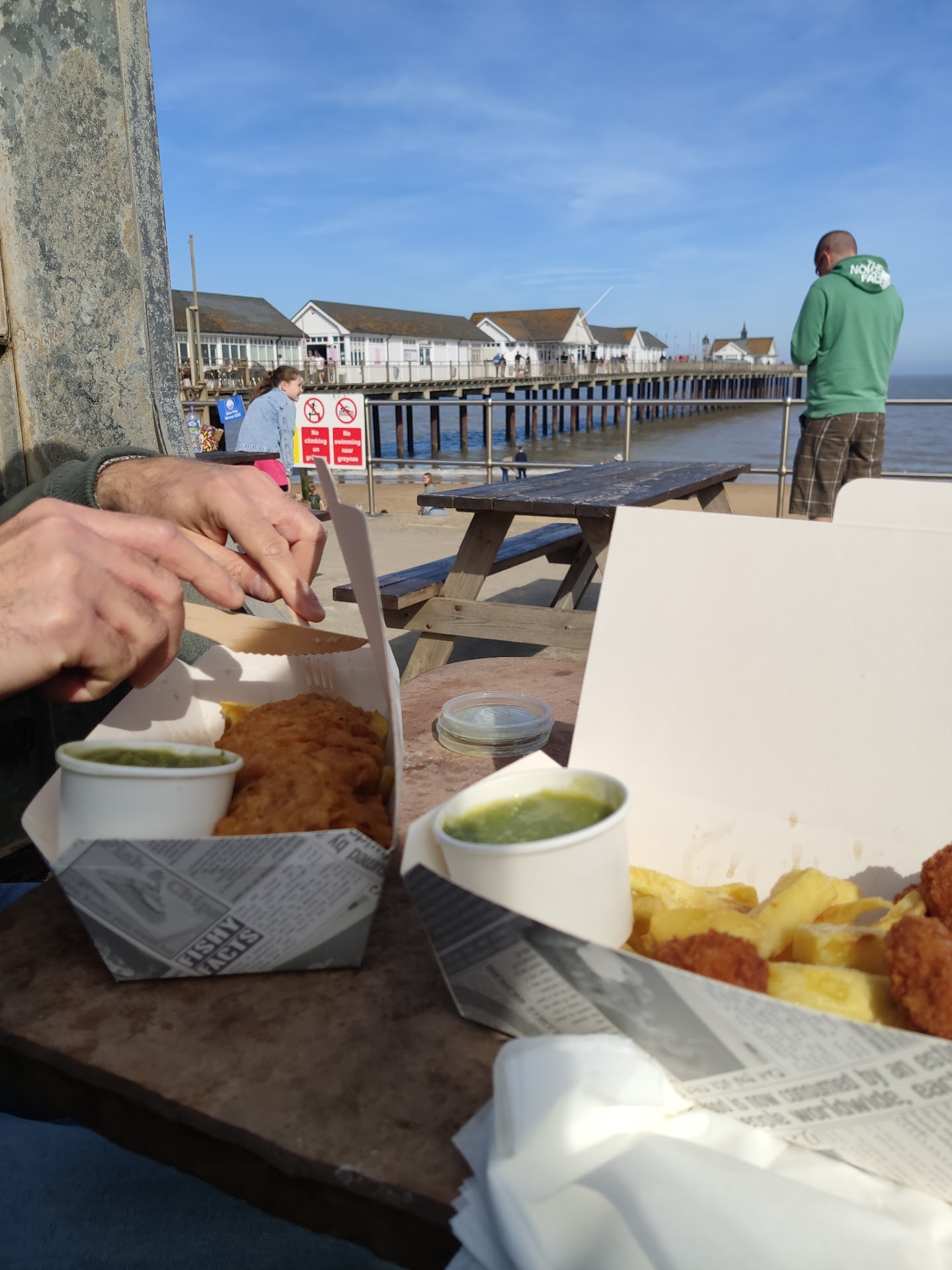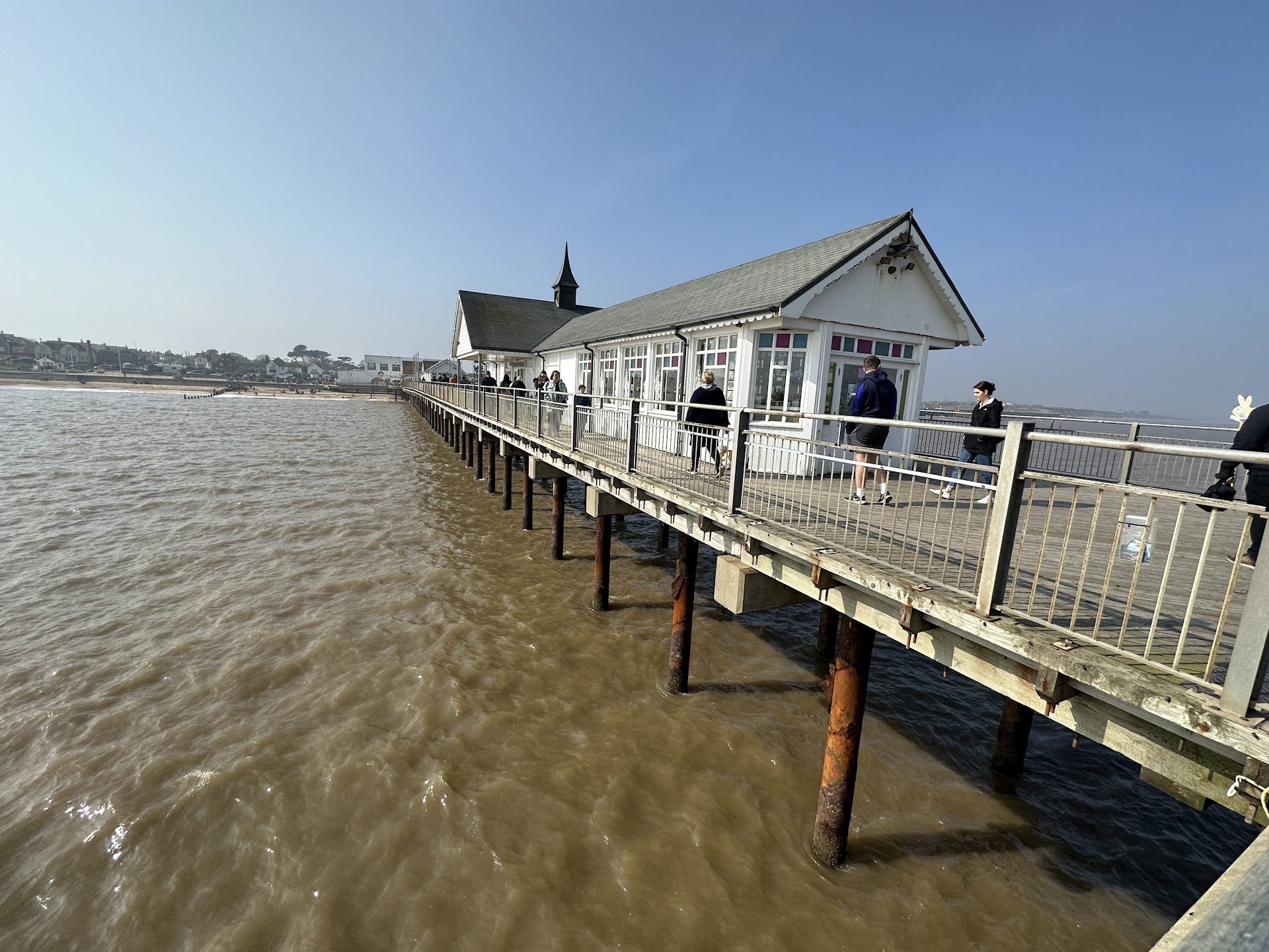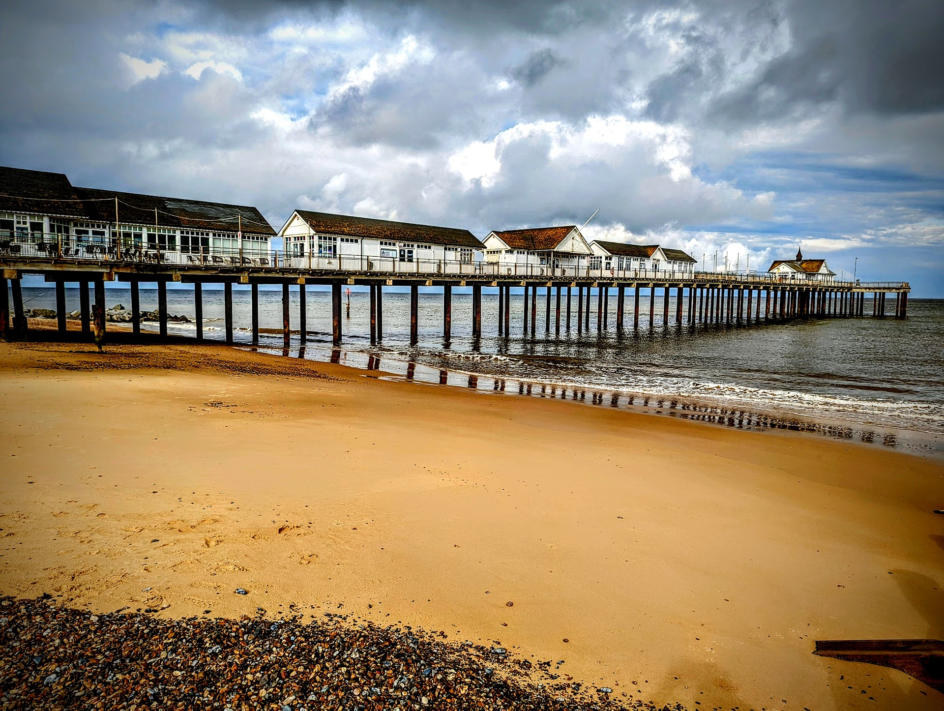 Really sweet little pier (- be ideal if they renewed the external white paintwork as it's looking abit worn/untidy in places, could make more of the George Orwell connection artwork perhaps, as this is/could be more special maybe? As it's a cool feature). This would make it all look really good, but obviously realise marine environments are very tough on buildings). However little shops are very well kept, interesting to look around, some nice products, nice staff (on our visit anyway).. & also provide good cover from showers(!) as do some seating areas (& there's a lot of outdoor seating too). It's free to walk the length; not very long so an easy walk, nice views of the town & sea, beach, etc. Found despite a little bit of renovation work in the middle, it was pretty flat, fairly wide, pretty accessible & quite easy to traverse. Some fishing off the pier end, you couldnt fit too many anglers on there 'tho, so busier days you probably couldnt/wouldnt want to try).. I didnt notice anyone catch, but intense rain prevented further enquiry! Toilets in the carpark are handily close by too, though you do have to come off the pier itself (- they had paper, water & soap all running well, reasonably clean; for public, at time of visit). Was impressed with the Boardwalk restaurant for lunch, at time of visit they were very friendly, polite, provided a quick service & nice food & drink selection, plenty of room. Had a very nice coffee & a nice rosé wine. Fish finger sandwiches with pea puree & salad, but done with 'real' v flaky fish & in an almost tempura-style batter (I think) & unusual dressing. Cafe style seating overlooking sea outside & restaurant tables inside. Would like to visit again for an evening fish meal (- presume locally caught?) as seem of a pretty good standard & not overly expensive ('tho we never find food out exactly 'cheap' anywhere now, but it wasn't excessive). Didn't go into end of pier show/old fashioned pier entertainment machines bit (can't think of correct name!?) but looked quite intriguing. Last visit was a bit disappointed with our fish & chip meal on the pier (- at entrance; plenty of seating or can take onto beach or pier), as it was rather small, felt over-priced, fish kind of 'over processed' & we didn't rate the quality much. However, this was some time ago(!) & so cannot judge this time as it could have changed, a lot. But it is very convenient to have it there. Ice creams were good 'tho & the range of bits & bobs, & treats on sale useful.. Brief look at modern arcade area, which was small & partner felt was a bit limited, & pricier compared to others, n some prizes offered really not great (lol). But not generally having frequented these for years & years(!) & no expert, I suspect they are all a bit like this?! (You could always have lost quite a bit of money in them if not careful).. However, it has quite a good range of different games & machines for a small arcade, old & newer, not all on screens which is nice, 'tho it even had a VR game area. I think it'd still be a laugh, especially for families to while away a bit of time in & ideal if the weather changes for the worst, which it did. So nice to have it there, obviously not everyone's cup of tea (- we much prefer looking at nature, getting a walk, food al fresco etc, which you can also do), but I have seen much, much more gaudier & overbearing arcades on seafronts! It's quite tucked away & not very loud, which is good (otherwise it'd spoil the pier I think?). So generally, there's a nice mix of different things to do...