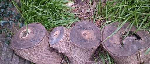 Specimen trees, such as "TREE OF HEAVEN - TULIP TREES - A MULBERRY TREE - FLOWERING SHRUBS"..