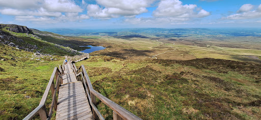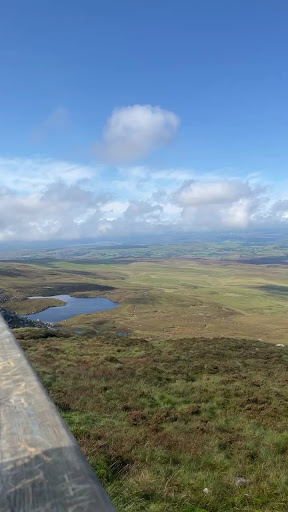 There are 2 car parks at the entrance. I believe both include a parking fee. Also, if you intend to use this parking, it is recommended to book it online in advance to avoid disappointment. There is a free parking area approximately 1 km away. The free parking area also has washrooms and picnic tables. It is near the Killykeeghan National Nature Reserve. Regarding the trail, the initial 3 km from the car park is a gravel road with easy to moderate difficulty. It is recommended to have good trekking shoes for this part. Taking a kid's trolley on this path wouldn't be recommended. After 3 km, the rest of the path is a proper boardwalk (wooden plank with metal net on top for grip). The total path on the boardwalk (to and fro) is approximately 6 km which can take anywhere between 1-3 hours depending on your speed. Most of this path is moderate level difficulty and only the final part of approx 0.5 km is very steep. It is recommended to always use the boardwalk as the grassland below could be wet/spongy. One should carry sufficient water and snacks...