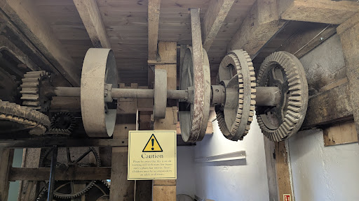 The mill itself is fascinating - it is in full working order, and the miller will tell you as much as you want to hear about how it works. Within reason you or the kids can operate some of the controls, and you can see the wheel turn, the wheat coming down the chuts into the mil stones, the stones rotate and the flour filling the bags. The sack hoist to the hoppers in the roof space work as well.