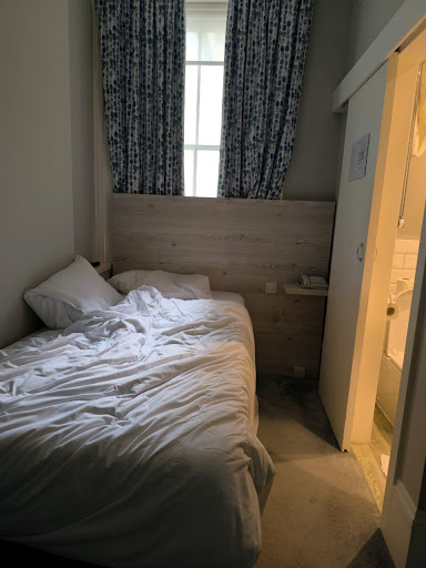 The Rooms are very small. The bathroom is also very small and cleanliness was clearly not a priority it seemed like the bathroom was not cleaned properly. The carpet was old and shabby. There was no iron provided. The fan provided was not enough to keep cool especially considering the weather was really hot this weekend and the window also opened slightly not allowing enough fresh air into the room. The toilet is placed right next to the bathroom door with a very small gap between the toilet and the door so it would hit you in your face if you leave it open whilst using the toilet quickly. The shower cubicle door opens inwards so you have to maneuver around in an awkward position just to close the door and use the shower which can be really difficult when the shower is literally one small square cubical. Considering the price paid for the room it is not worth it at all. The rooms are dated old smelly and quite frankly inadequate.