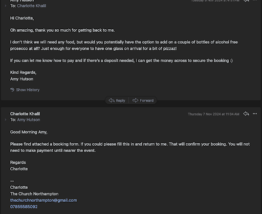 I enquired with Charlotte (who I am assuming is the booking manager/general manager) back in November of 2024 to hire the Church for 2 hours in March 2025. The enquiry email was picked up fine, and I asked about payment details and any deposits that would be needed. I was told that no deposit would be needed and we wouldn't need to pay any money until closer to the event. I felt this was a bit strange for a venue like this, because how do you protect the business/bookings without taking a deposit? However, I filled out the required booking form and sent it across the same day I received it. I didn't get a confirmation email for well over a week, so I called Charlotte directly to ask if she had got it. She said she had and then later that day confirmed this via email.