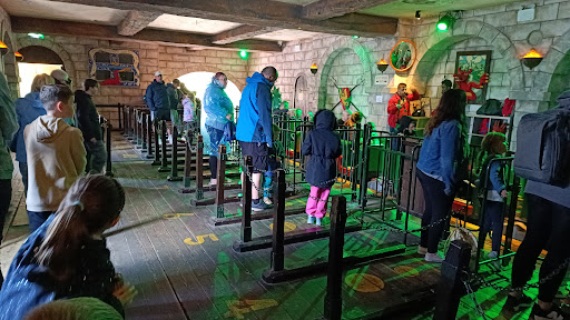 First in the queue, you climb up many stairs, and then you arrive at these tower parts. Here are some tips for the roller coaster. If you want to go SUPER fast, you should go in the back. In the front, you have a good view of the drops you will go down. I couldn't know what was going on in the inside bit as it was so loud! The first section of the coaster goes inside the castle, taking you through 3d lego models. Then the ride goes up a lift hill, then drops you on a steep drop. It takes you through twists and turns at high speeds. Then it goes up another time and gives you a steeper drop through a cave. Then, after 20 seconds, it takes you back to the station. Overall, it was...