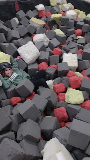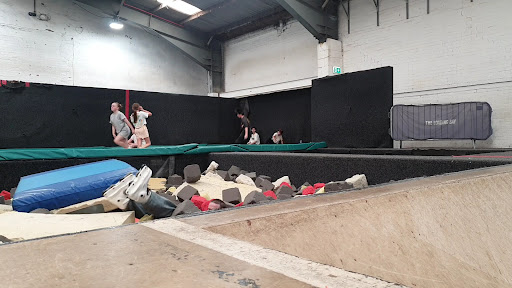 As well as two trampolines and foam pits, there is also a large quarter pipe in the room, with curved launch kicker into the left hand foam pit.