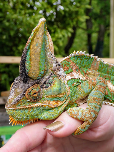 Finally we met the Veiled Chameleon. By this point the zoo had closed to the public and so there was no-one around, so they brought the chameleon outside for us. Amazing colours, and it was very happy just sitting on us while taking photos. We've never seen a chameleon that close before and it was one of the highlights of the day.