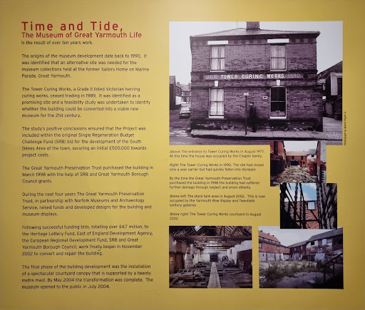 Read moreThere isn't a great deal to do in Great Yarmouth, although I will probably be called out for that comment! I love museums (musea), particularly when they are associated with the local environment and the Time and Tide museum couldn't be more appropriate. It is housed in an old fish processing factory where Great Yarmouth's herring catches were processed. The museum chronicles the area from approximately 1000a.d. when a sandbank formed and fishermen used it to dry their catches. The museum has a faux street inside which shows the local trades active with realistic models and vitrines full of small local artefacts. There are plenty of information boards, video screens and displays which give you an excellent feeling of being there. My wife and I were the only visitors at the time, which is run, very well, by Norfolk County Council. A very informative and immersive experience. Highly recommended, if you happen to be in Great Yarmouth...