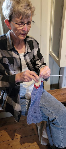 There are current knitters working on projects and available to chat with. There is also a massive scarf project to which visitors to add a few rows while visiting. There are also, at other times, spinners demonstrating.