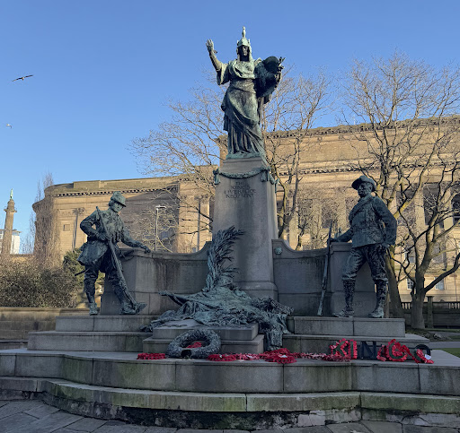 The gardens contain seven memorial statues, each of which is recorded in the National Heritage List for England as a designated Grade II listed building. The Rathbone Monument commemorates William Rathbone who died in 1902, although the monument had been made in 1899. It was created by George Frampton, and consists of a bronze robed figure standing on a stone pedestal. Its inscription records that Rathbone founded the district nursing movement, and the forerunners of the Universities of Liverpool and North Wales. The Gladstone Monument is to the memory of W. E. Gladstone, a former Prime Minister, who was born in Liverpool and who died in 1898. The monument dates from 1904 and was made by Thomas Brock. It consists of a bronze figure of Gladstone holding books and a roll of parchment, standing on a stone pedestal containing carvings of female figures representing Truth and Justice. The Balfour Monument commemorates Alexander Balfour, businessman and philanthropist who died in 1886. The monument dates from 1889, was sculpted by Albert Bruce-Joy, and consists of a bronze figure on a stone pedestal. The Lester Monument is to the memory of Canon T. Major Lester who died in 1903, and who founded charities for children in Liverpool. It was made by George Frampton, erected in 1907, and depicts a bronze figure holding a child, standing on a stone pedestal. The Nugent Memorial commemorates James Nugent, a Roman Catholic priest who worked with child welfare. The monument is dated 1906, was created by F. W. Pomeroy, and consists of a bronze figure in the attitude of blessing, and a ragged boy, both standing on a stone pedestal decorated with a bronze wreath. The Forwood Monument is to the memory of Sir Arthur Forwood, a local businessman and politician, who died in 1898. The monument was erected in 1903, was made by George Frampton and, again, is a bronze figure on a stone pedestal. Also in the gardens is a monument commemorating the service of the King's Regiment in the South African War. It is dated 1905 and was sculpted by Sir W. Goscombe John. It is in white stone with a bronze wreath, and includes the figure of Britannia, military objects, standing...