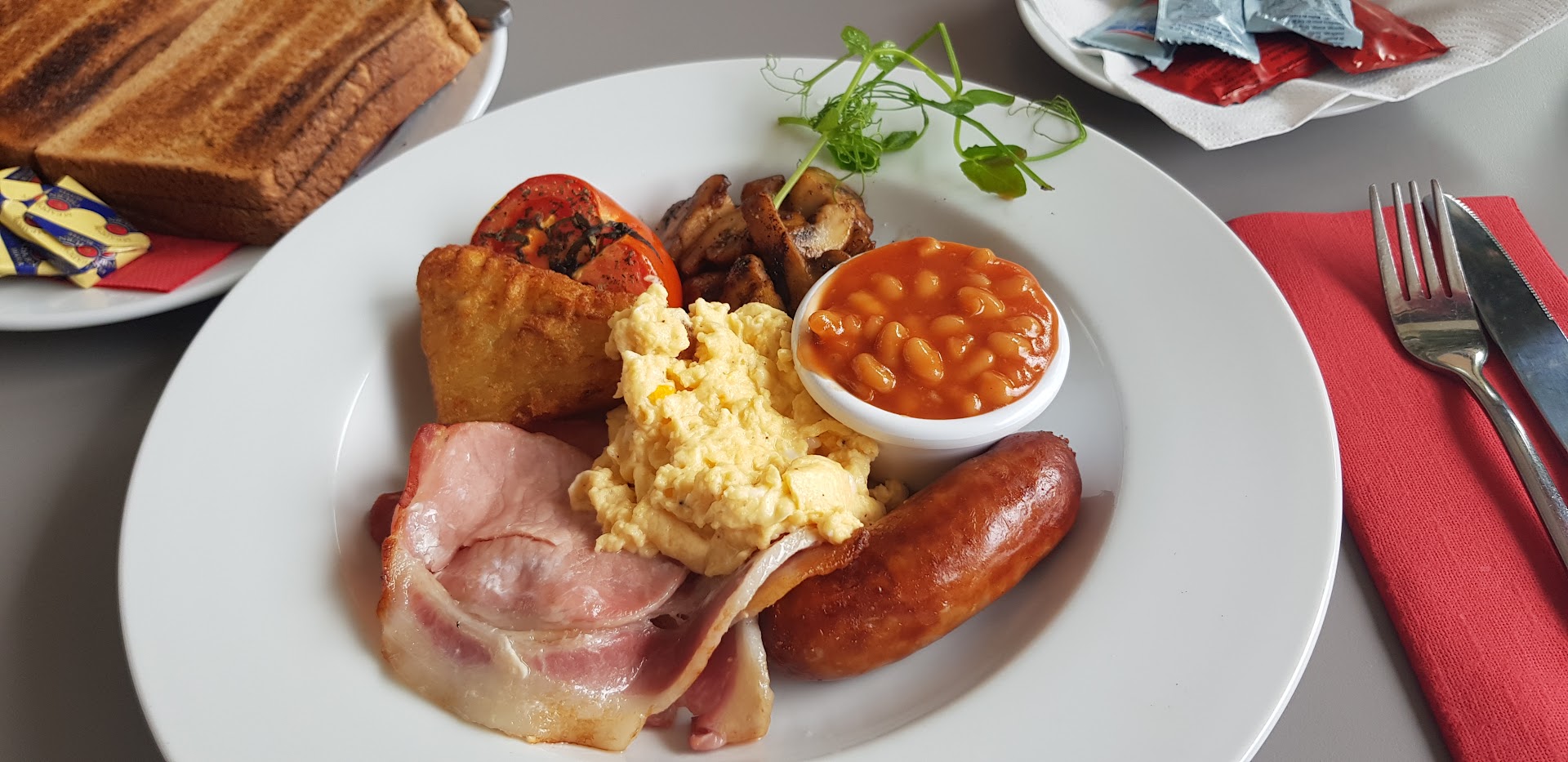 We went into the cafe area where breakfast is served until 11.30am. It was just before 11.30 am, so we asked of it was now lunch only. Well what can I say, the ladies at the front spoke to Anthony from the kitchen. Anthony came out to speak to us and couldn't do enough for us. "A breakfast", he said, "no problem". I asked for scrambled egg, also not a problem. Nothing was a problem for Anthony today. The breakfast arrived, which was £8.00. Wow, it was perfect and included 2 pieces of toast and a free filter coffee or tea.