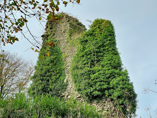 A dark, ivy-covered ruined tower is all that is left of one of the more important 13th-century castles of Glamorgan. It was built in about 1250 by Richard de Clare, lord of Glamorgan, to hold this hill district of Meisgyn which he had just wrestled from its Welsh overlords. The castle's strategic and commanding position, guarding the important route from the upland to the lowland zone, is very apparent.