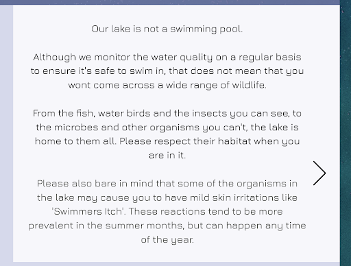 I really hesitated to post this review because I love outdoor swimming and I don't want to discourage access to spaces, but I feel people need to be warned. I swam here a couple of weeks ago and like others, suffered a severe swimmer's itch reaction. While the organisers state there is information 'all over the website' and that they warn you in advance, this is misleading. First, they send out a warning email the night before, but don't provide any advice. Instead they say 'find out more on our website'. If you then go to their website, it's near impossible to find any info and what's there is very limited (see photos). The only way you get any useful tips is if you happen to send them an email, as it's their auto reply. However, none of that info is in your booking confirmation either. When I notified the staff afterwards, there was a real lack of empathy and all they could say was "well we warned you it could happen". Even the advice a member of staff sent me in response to my notifying them was limited at best. I'm not sure why the detailed info in their auto reply isn't made accessible to everyone on booking. In addition, one of the tips is to bring your own water to rinse off after you swim which quite frankly is ridiculous. If you don't have appropriate facilities to manage a known issue, you should be closing the lake (as a swimmer, I'd much prefer this to paying for an allergic reaction). I swim at a number of different wild swimming spots and have never had any issues. At the very least, they should be offering a refund to people who do have this reaction seeing as they don't have appropriate facilities nor is the guidance made...