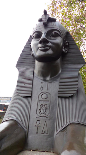 Plaques surrounding the base of Cleopatra's Needle describe its origins in Egypt as well as the 1877 troubles at sea. There is also visible bombing damage on one of the black Spinxes, which you can see quite clearly, the result of German air raids during WWI in 1917.