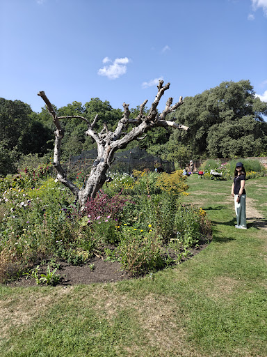 Fulham Palace’s walled garden is a serene, 3.5‑acre haven tucked behind historic brick walls—a place that feels both lovingly tended and genuinely alive with purpose. Reinstated after extensive restoration and reopened in 2012, it blends heritage planting with productive plots: a neat knot garden, a vinery, an apple orchard with an apple‑tree arch, bee hives, and generous borders that hum with seasonal color. The plant choices nod to centuries of botanical curiosity at the Palace—from North American apple varieties that echo early transatlantic connections to the knot garden’s red‑blue‑yellow scheme inspired by Bishop Blomfield’s coat of arms.