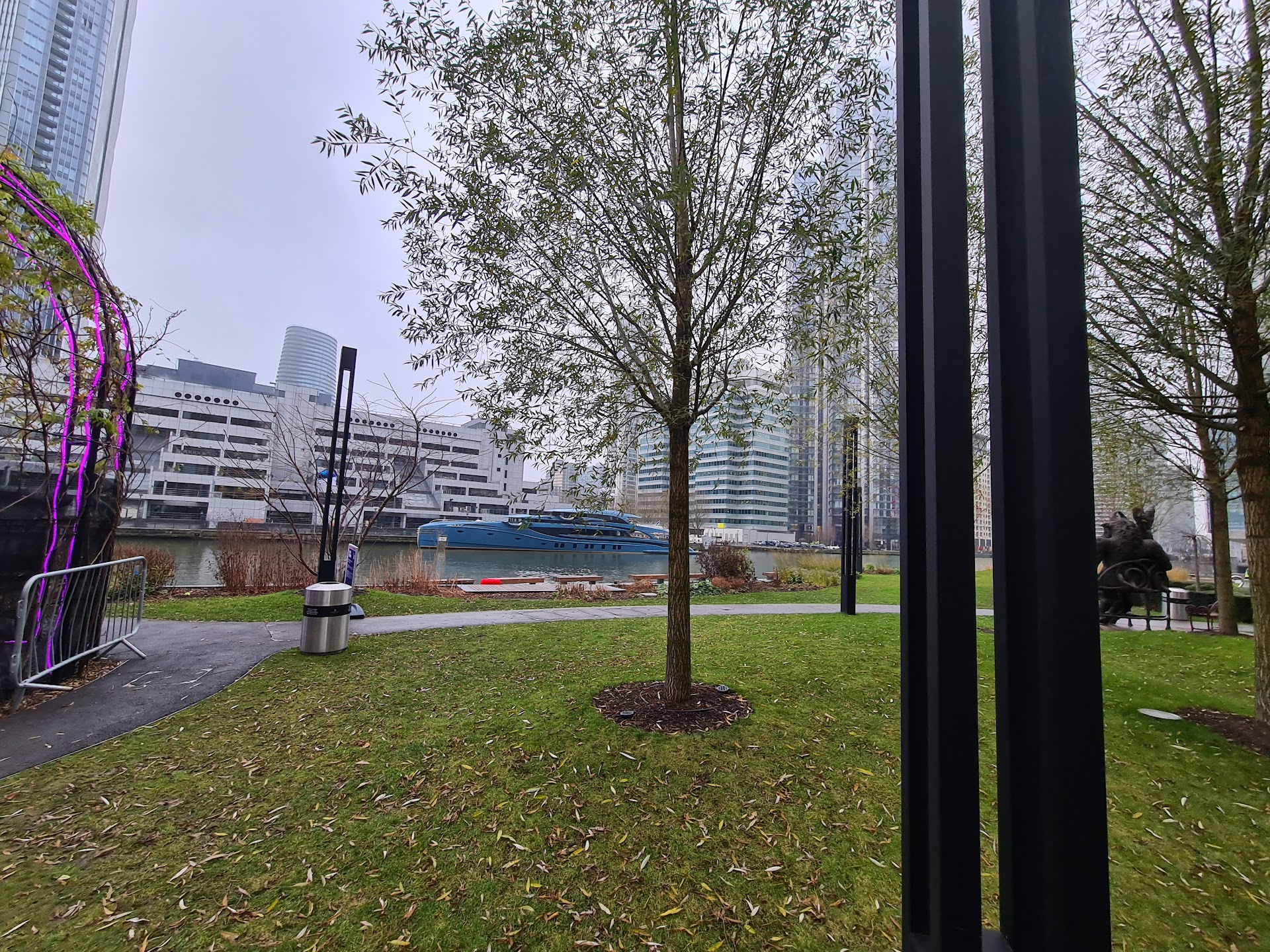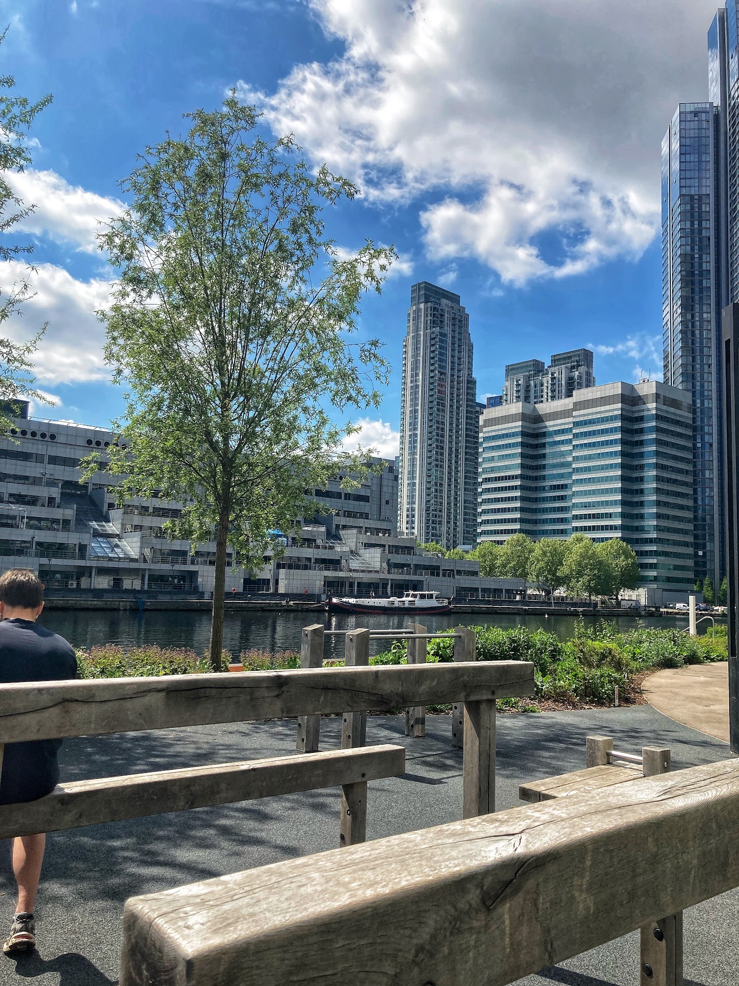 At the other end of the Park, there is an outdoor gym! Between the park and the North Dock water, a splendid Harbour Quay walking trail with benches along the bank of the North Dock makes it very attractive and welcoming! Swans or boats or high-rise buildings or clouds/sun playing with the top of the towers - there are plenty of things to watch! Not to mention the Free Outdoor Art Trails - largest outdoor art installationa in London - some permanent sculptures along with temporary art installations enrich the space substantially!