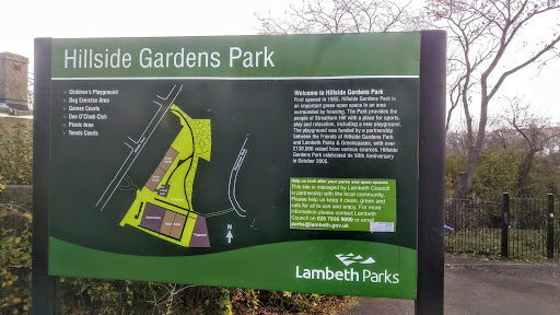 Read moreThis is a very simple park with picnic tables and climbing frames for older children. For smaller children there is a slide house and seated round-a-about. Hillside Gardens has tennis courts, basketball courts and a Sure Start children's centres situated within the gardens. It's good for small picnics as there is a fairly large grass area. There is also an outdoor gym area. It is generally nice and...