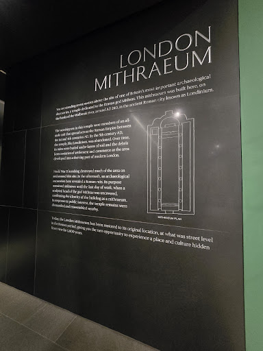 Read moreA really interesting small museum in the heart of London, literally adjacent to an exit to Bank tube station and only a short walk from the main exits and Cannon Street too. The museum itself isn't huge, with a small display of all the many artefacts found on site. There were captions for a few giving some insight and of the ones labeled they were all very interesting - however that was 9 out of probably 60 or so. There were tablets next to this which may have had more detail but I didn't see anyone using them so I wasn't sure. You then descend downstairs into a waiting room with a couple of small things to look at. There are some projections on the wall and, even when a little busy, the place has seating and a nice atmosphere. You can view the temple once every 20 minutes - there is a short show in which they play a variety of sounds and use light to make you feel as though you are back in ancient Roman times, before the lights turn on and you can see the temple in full. It is very small, but you can still see the bases of the columns, the shape of the apses, the very well-preserved brickwork at the far end, and where some of the artefacts may have been found. You get another 15 minutes or so to look around - plenty of time as it is very small, before you are ushered back to the waiting room and can look more around the rest. The 20 minute slots help keep it quite empty inside the temple, and as it isn't a busy place the rest is quite spacious too. All in all, it's a very interesting little place - allow 45 minutes to an hour to see it all and use the nice loos - down some winding corridors but nice and very clean. I wouldn't travel to this area of London just to see this from afar - if you go then have a look at other things in the area too to make...