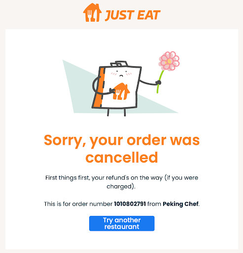 Very disappointed with this restaurant last night. We had ordered through Just Eat with our order accepted at 18:29 with an estimated time of delivery of 19:40. Having waited for an hour, the restaurant then cancelled our order at 19:28... a whole hour after accepting our order. We then were left to find an alternative restaurant, on a Friday night. This was particularly disappointing as we had eaten from there on many occasions in the past and the food was always good, but if you're going to be let down like that at the last minute then we won't be ordering from...