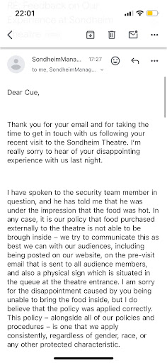 Another baffling policy—why is food completely banned, and under what authority is the theatre conducting bag checks? If the concern is security, proper screening devices exist; random manual checks are outdated, inefficient, and frankly, ridiculous. The British theatre industry is both absurdly strict and laughably outdated, all while maintaining an air of undeserved self-importance.