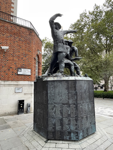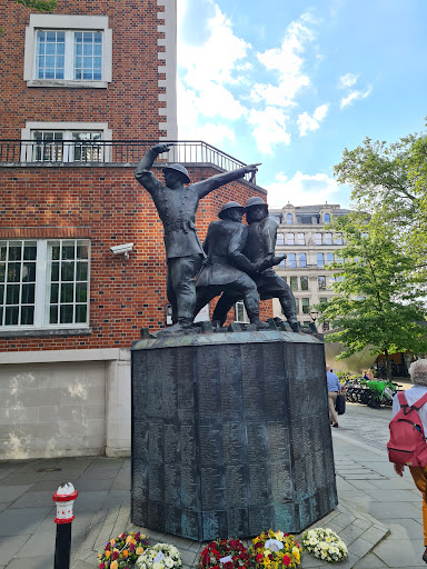What you see are three bronze figures of firefighters battling a blaze as a result fires that erupted throughout the streets of London during the infamous Blitz (1940-41), a nightly German bombing campaign during WWII. There is a panel on the monument with the list of names of those who lost their lives in defence...