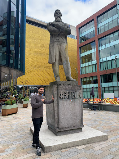 Read moreVery interesting but why is it here in Manchester? Well the 22 year old Friedrich Engels was sent to Manchester in 1842, which was the centre of the industrial revolution, by his wealthy family to work in a mill and hopefully calm his revolutionary ideals. He formed a 20 year relationship with a radical Irish woman and then after she died he married her sister hours before her death! He also regularly met up with Karl Marx. The Soviet built statue was rescued from a field in Ukraine where it had been cut in half and dumped and relocated to recognise his time...