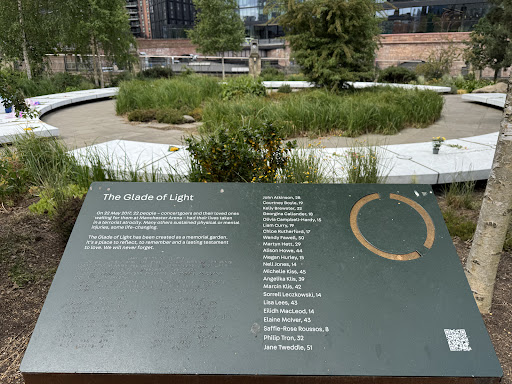 The Glade of Light is a memorial in Manchester, England, that commemorates the victims of the Manchester Arena bombing of 2017. It opened to the public on 5 January 2022 and an official opening event took place 10 May 2022.
