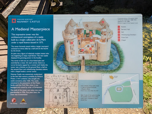 Read moreDistinctive moated castle in the centre of the charming village of Nunney. The castle dates back to the mid 14th century and was commissioned by local knight John de la Mare. It saw significant revisions in the 16th century, but didn't last much longer as Parliamentarian forces attacked the castle in 1645, causing extensive damage. The ruin seen today is impressively complete, with the close set round towers giving it a very striking appearance. The castle is free to visit, a couple of minutes walk from a parking area up the hill. Unfortunately the bridge across the moat was closed and awaiting repairs when we visited, so it wasn't possible to see inside the ruin. That said, the path around the perimeter of the moat gave a good view of the whole building. We left very happy, having seen a kingfisher and an otter, so the moat is clearly good...
