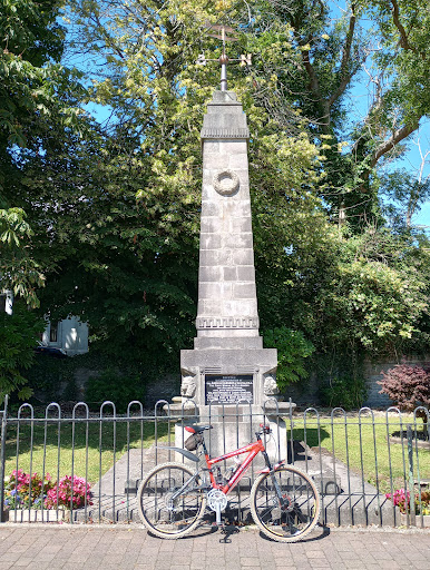A cenotaph style monument with a wreath on its front face, topped by a weathervane in the shape of a seaplane, the base bearing lions' heads at the corners over small bowls, and on its front face an inscribed plaque.