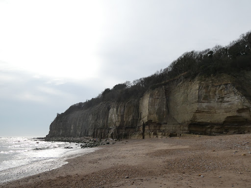 Shingle beach with a backdrop of rugged sandstone cliffs. Relentless coastal erosion forms striking shapes in the base of the cliff, with caves, pillars and arches on a miniature scale. Different coloured bands of rock give the cliffs a very distinctive appearance, more similar to parts of the Jurassic coast than the rest of East Sussex. It's therefore unsurprising that fossils can be found here. The beach has appeared in a couple of music videos, firstly David Bowie's Ashes to Ashes and more recently Keane's Atlantic. There's plenty of free roadside parking a short walk from the beach. The walk to Winchelsea Beach is rewarded with a nice little café, and you can go further to Rye Harbour to make a day of it. There are toilets a couple of minutes walk from the beach, though they are closed over the winter season. Important note - the sea comes right up to the base of cliffs, so be aware of the tide times if you're following the beach any distance...
