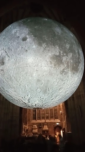 Museum of the Moon is a touring artwork by UK artist Luke Jerram. Measuring seven metres in diameter, the moon features 120dpi detailed NASA imagery of the lunar surface. At an approximate scale of 1:500,000, each centimetre of the internally lit spherical sculpture represents 5km of the moon’s surface.