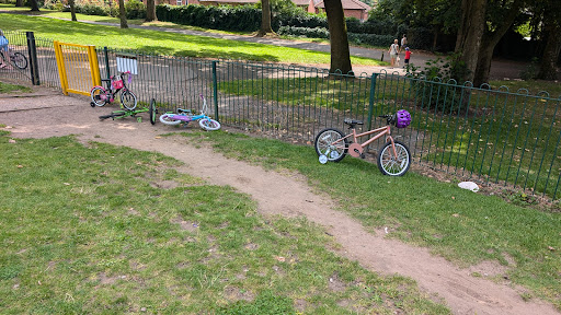 As well as a play area for younger children there are large open fields which are often used by locals to play sports and a tennis court area which is in need of refurbishments and a former small golf course which thanks to being fully enclosed and having at least three gated entrances has become a fun place to allow dogs off the lead so they can run and socialise with other dogs. There is a strong community spirit amongst most of the dog owners who use this part of the park and the dogs are usually well behaved and well controlled. Dog owners there are usually more than happy to join up in groups and meet at certain times of the day so their pets can become as good friends as the owners.