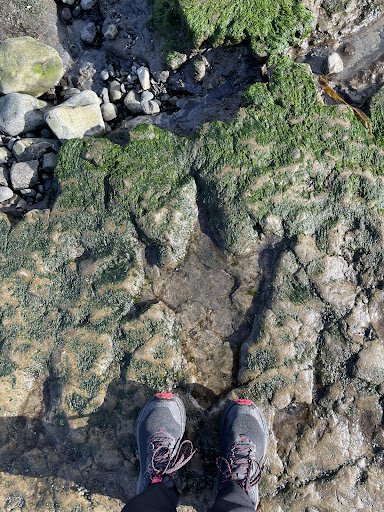 Because it's not only a beach. There are also the dinosaur footprints to be seen. Or not....because I didn't catch them. Even though I walked along the beach over rocks and mossy stones. The tide probably wasn't right and the footprints in the water. But since we didn't come specifically for that (just a quick stop-by) I didn't mind.