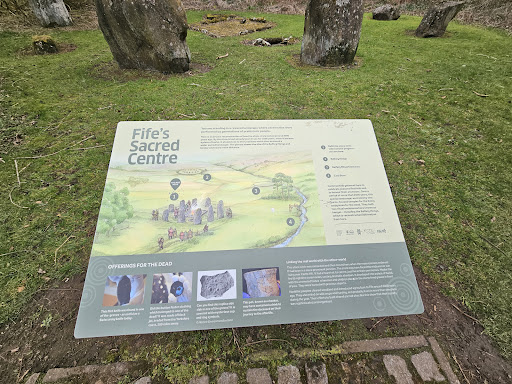 We walked here from the Balbirnie Caravan Clube site. There is a map in the main estate car park clearly showing the foot paths and stone circle. It is an easy, child friendly walk, past Balbirnie house and golf club to the edge of the estate. It is a small circle just at the edge of the road, behind some houses. There are information boards about the site and...