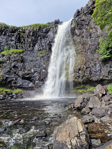 Eas Fors so good they named it twice! From Wikipedia: The name is tautologous: eas is Gaelic for waterfall, and fors or foss is also Norse for waterfall, so "Eas Fors" means "waterfall waterfall." And it's three times a lady 🎶 as it tumbles in torrents from the highest level to an easy viewing area a few yards north on the same side as the pull-in where approx 8 cars can easily park. Below the road bridge there is a 'puggy' patch of ground/long grass/rocks where you can squelch your way to where the sparkling fresh water tumbles happily twice more over blind precipes before a long vertical drop into a pool on the beach that apparently one can swim in (chest deep for average adult so a previous reviewer noted). For a while I stood at the top of these on a 'safe-ish-looking' rock that was sprouting soft pincushions of Sea Pink plants with numerous flowers.. viewing the isle of Ulva and the beautiful mountains of the Ross of Mull. This must have been early September and my fellow visitor were few.. 3 cars and a motorbike in the parking place. Do visit.. 100% worth it but be very careful.. its tempting to tiptoe closer.. but that squelchy ground shelves away quickly...