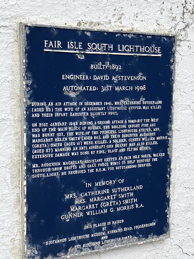 Built in 1892, this is 1 of 2 lighthouses on Fair Isle, and was Scotland's last manned lighthouse. There's a panoramic view of the rocky coast and ocean from its shore. The lighthouse is not open to the public for visiting. It has a noble, tragic history. For 150 years, this lighthouse was manned by Robert Stevenson, his family and descendants. His grandson was the famous author Robert Louis Stevenson. In 1941, the lighthouse was struck by an air attack. It sustained significant damage, and the keeper's wife and child...
